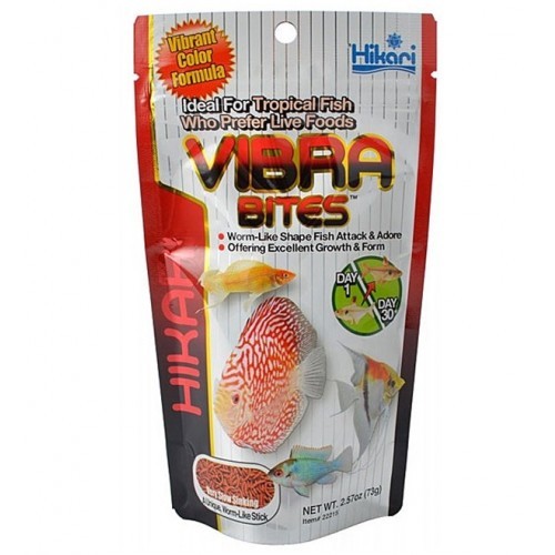 Hikari Vibra Bites is een uniek voer wat ontworpen is om de vorm en beweging van levende rode muggenlarven na te bootsen. Het langzaam zinkende voer beweegt door de stroming in het water, zoals levend voer ook zou doen. Dit lokt een eetreaktie uit, bij de meeste vissen die zijn gek op dit soort voer.