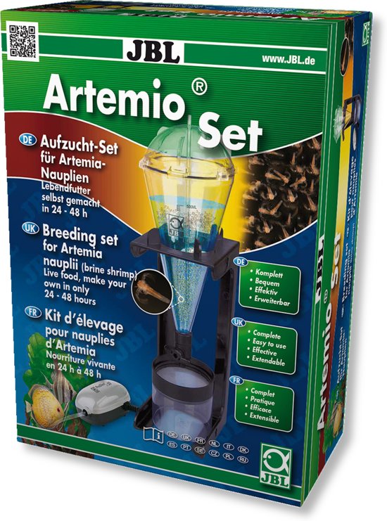 Inhoud: 1 kweekset voor levend voer, ArtemioSet, incl. 1 trechtervormig broedreservoir met koepeldeksel, 1 standaard met schroeven, 1 ventilatiepomp, 1 opvangreservoir, 1 artemiazeef, 1 luchtslang van 8m en 1 terugslagventiel.