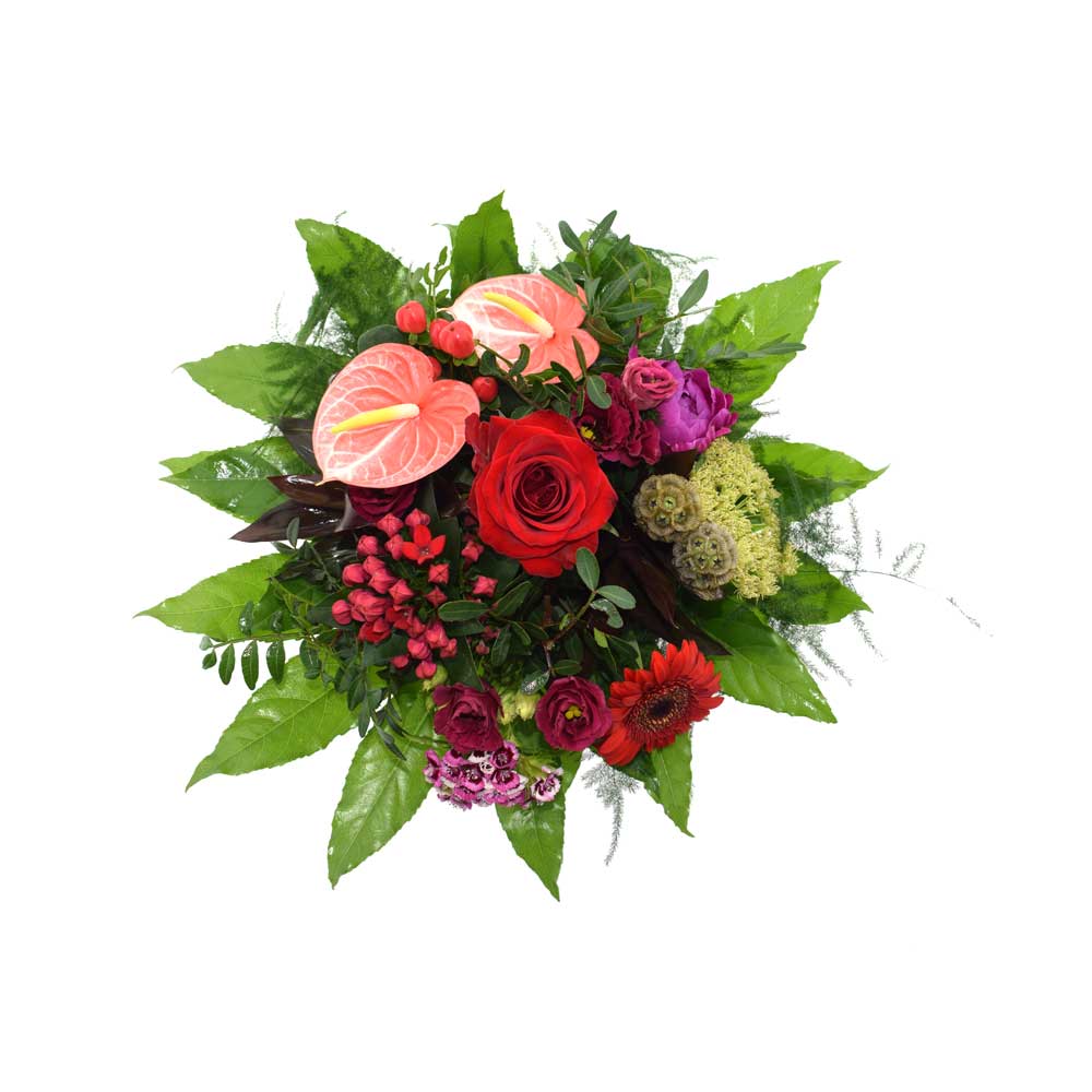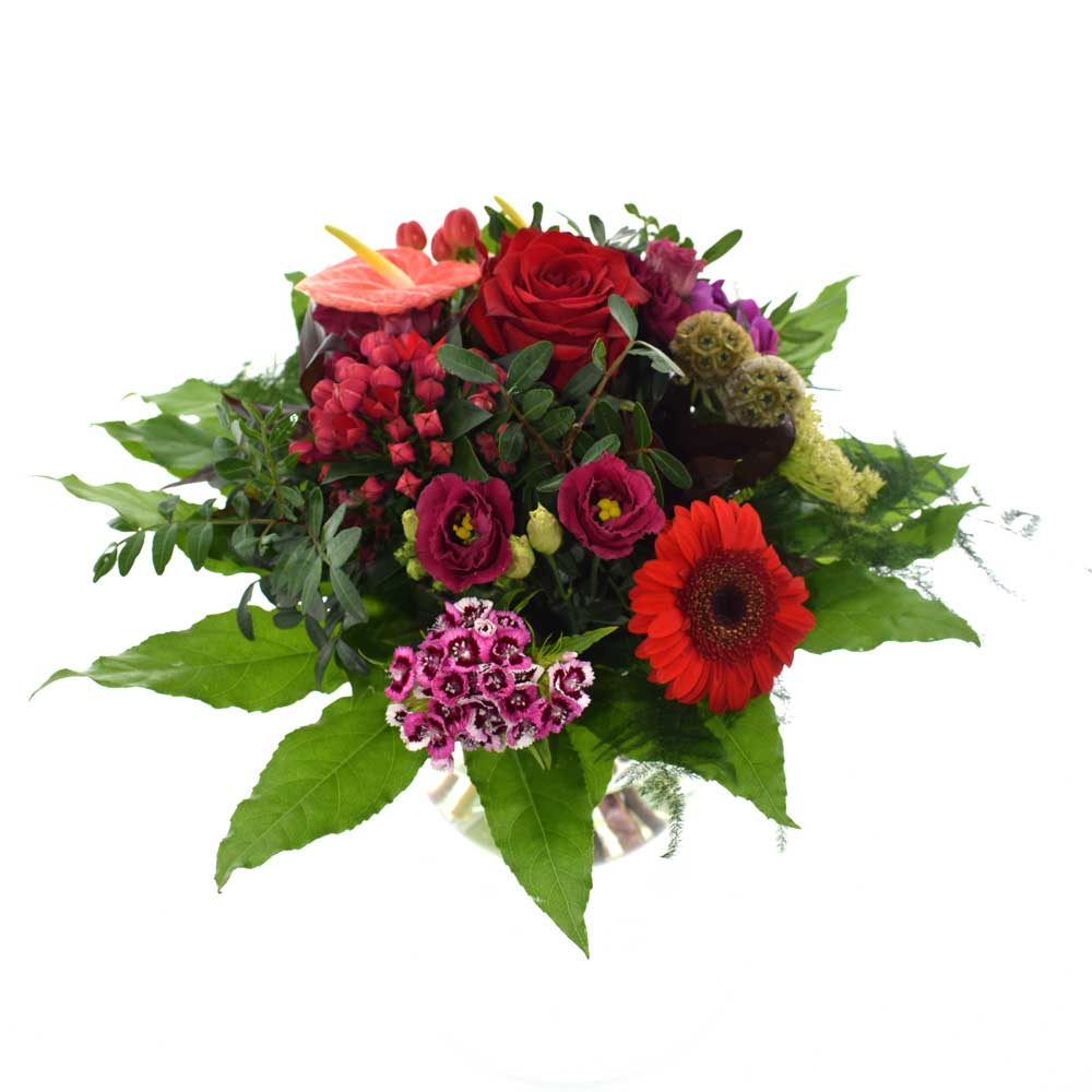 Dit mooie compacte ronde boeket is vol en vrolijk, hiermee maak je elke ontvanger blij. Bevat o.a.: gerbera, duizendschoon, roos en anthurium.
