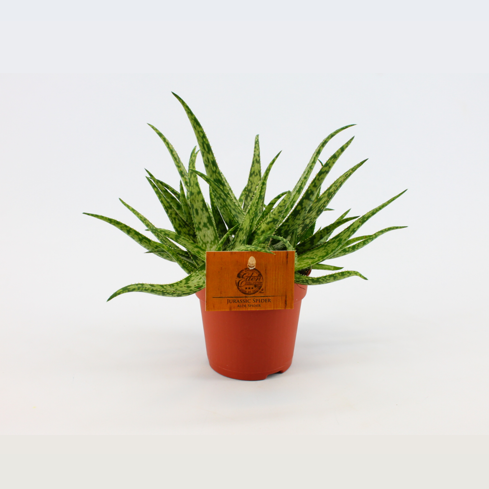 De Aloe Spider is een opvallende verschijning. De lichtgroene bladeren hebben een tekening met diverse groene tinten erop.