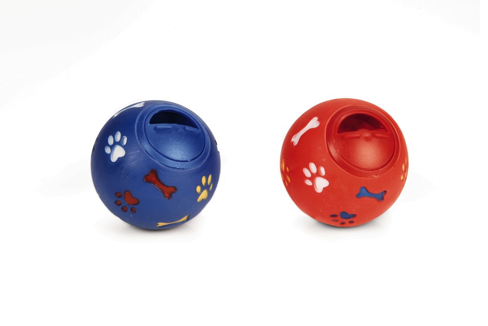Een snackbal voor de hond. U stopt snoepjes in de bal en al spelenderwijs zal uw viervoeter beloont worden. Deze snackbal is verstelbaar voor verschillende maten snacks. Kleur: assorti. Doorsnede snackbal: 8 cm.