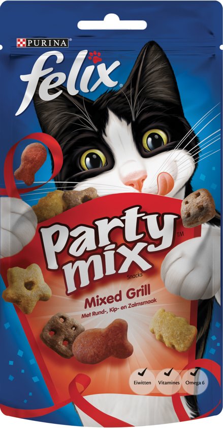 Deel nog meer liefdevolle en ondeugende momenten met je kat met Felix® Party Mix™. Het bevat een onweerstaanbare, kleurrijke mix van snacks vol van verleidelijke aroma’s, heerlijke smaken en aantrekkelijke texturen. Dat is niet alles! Felix®Party Mix bevat eiwitten, vitamines en Omega 6-vetzuren die helpen bij een gezond en gelukkig leven van je kat. Felix® is verkrijgbaar in meerdere varianten voor je kat. Probeer en geniet vandaag nog van deze spannende varianten!
