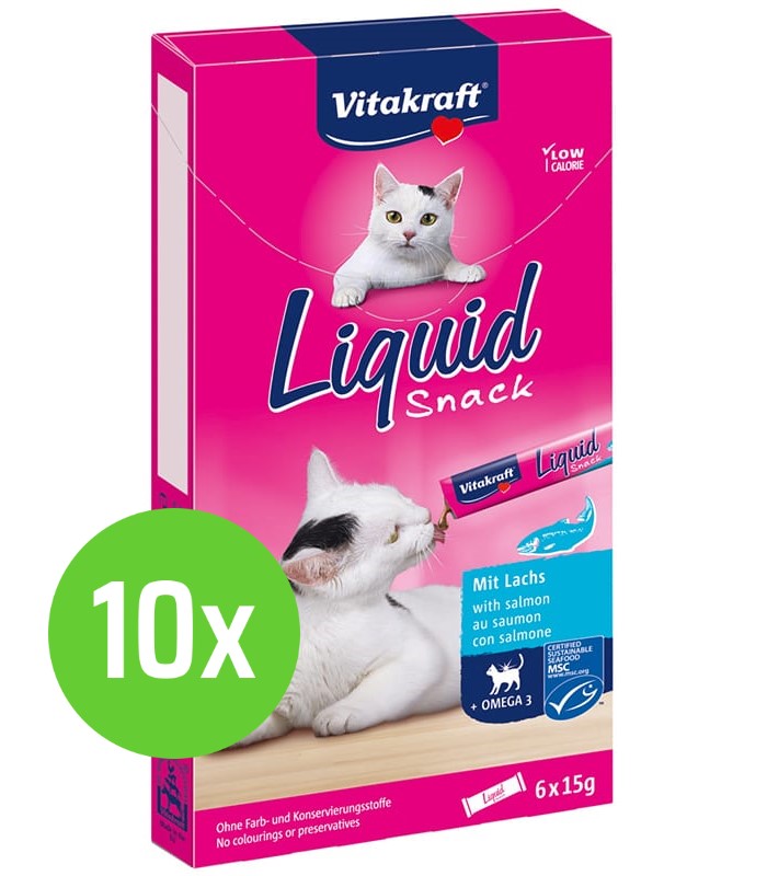 Vloeibare snack met zalm en omega 3 voor de ondersteuning van de huid en vacht. De snack kan puur, als toplaag over de hoofdvoeding om de acceptatie te verhogen of ingevroren als ijsje gevoerd worden. Het bevat weinig caloriën, heeft een suikervrije receptuur en is voor katten vanaf 3 maanden geschikt. De snack is per 6 stuks verpakt.
