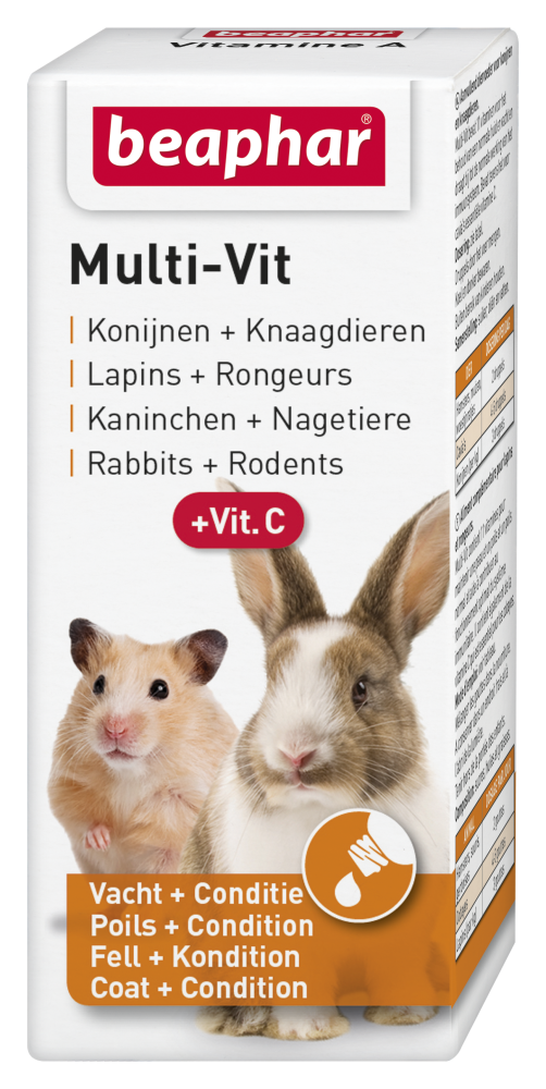 Multi-Vit konijnen + knaagdieren bevat 11 vitaminen voor het behoud van een normale huid en vacht en draagt bij tot de normale werking van het immuunsysteem. Bevat tevens het voor cavia's essentiële vitamine C.