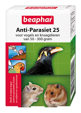 Beaphar Anti-Parasiet 25, spot-on voor vogels en knaagdieren van 50-300 g, 25ug ivermectine per pipet. Diergeneesmiddel vrij van registratie, voor de behandeling van externe parasieten (luizen en mijten) en /of van darminfecties met spoelwormen bij knaagdieren (goudhamsters, gerbils en boeroendoeks) en vogels van 50-300g (zoals grote parkieten, prachtrosella’s, Japanse kwartels en beo’s).