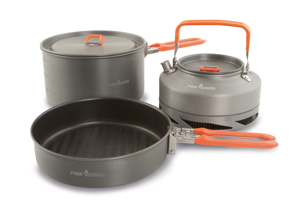 Een complete pannenset van Fox. Deze Cookware Set bevat de juiste pannen en ketel om een goede maaltijd of een lekker bakje koffie klaar te maken aan de waterkant. Gemaakt van heavy duty aluminium, met een anti aanbaklaag en opvouwbare handvatten.
