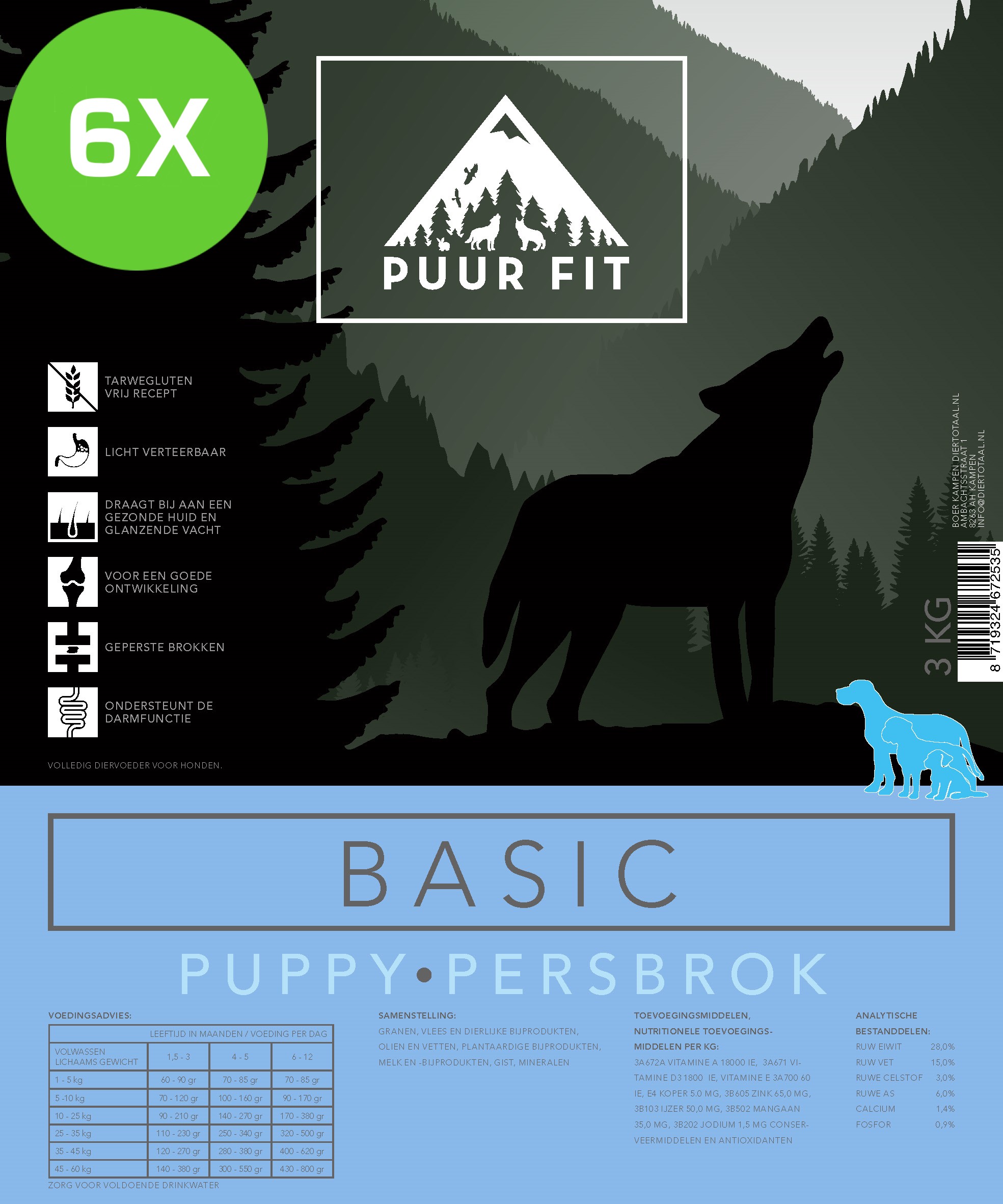 Puur Fit basic puppy persbrok is een hondenbrok van kwaliteit. De Puur Fit basic lijn heeft een goede prijs-kwaliteitverhouding. De brokken zijn gemaakt op basis van een tarwegluten vrij recept. Puur Fit bevat een hoog vleespercentage. Voor puppy’s van alle rassen zijn deze brokken geschikt. De hondenvoeding bestaat uit geperste brokken en bevat een hoge energiewaarde. Deze brokken zijn koud geperst, hierdoor blijven de voedingstoffen beter behouden. Door deze manier van produceren valt de brok in de maag van de hond direct uiteen en kan het verteringsproces starten. Voedingsstoffen komen vrijwel direct beschikbaar en de brok is daarom uitermate geschikt voor honden die enige vorm van prestatie moeten leveren zoals behendigheid, politiehondentraining en andere vormen van sport. Tevens draagt Puur Fit bij aan een gezonde huid en glanzende vacht. Ook ondersteunt Puur Fit basic de darmfunctie. Tenslotte bevat Puur Fit alle benodigde vitamines en mineralen.