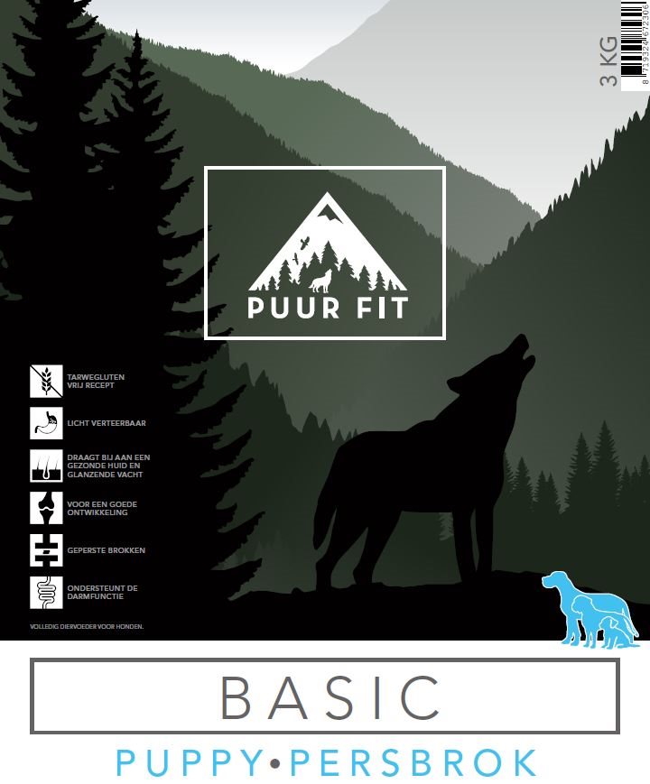 Puur Fit basic puppy persbrok is een hondenbrok van kwaliteit. De Puur Fit basic lijn heeft een goede prijs-kwaliteitverhouding. De brokken zijn gemaakt op basis van een tarwegluten vrij recept. Puur Fit bevat een hoog vleespercentage. Voor puppy’s van alle rassen zijn deze brokken geschikt. De hondenvoeding bestaat uit geperste brokken en bevat een hoge energiewaarde. Deze brokken zijn koud geperst, hierdoor blijven de voedingstoffen beter behouden. Door deze manier van produceren valt de brok in de maag van de hond direct uiteen en kan het verteringsproces starten. Voedingsstoffen komen vrijwel direct beschikbaar en de brok is daarom uitermate geschikt voor honden die enige vorm van prestatie moeten leveren zoals behendigheid, politiehondentraining en andere vormen van sport. Tevens draagt Puur Fit bij aan een gezonde huid en glanzende vacht. Ook ondersteunt Puur Fit basic de darmfunctie. Tenslotte bevat Puur Fit alle benodigde vitamines en mineralen.