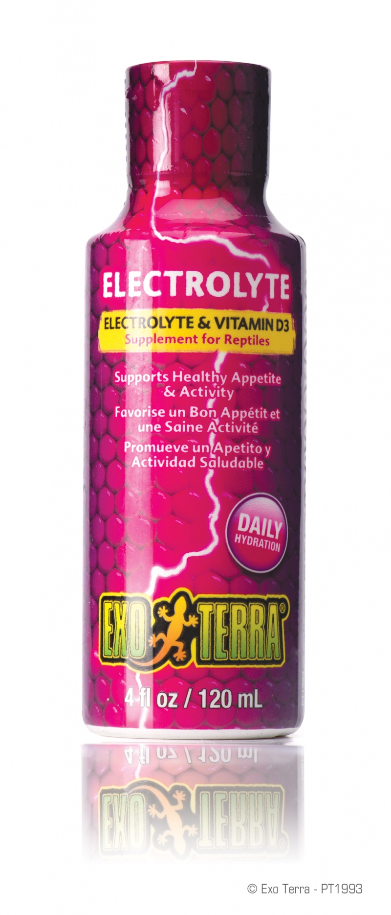 Electrolyten zijn mineralen (magnesium. kalium. natrium en calcium) die verloren gaan door middel van dehydratatie, voornamelijk in stresssituaties. Electrolyte onderhoudt een evenwichtige elektrolytische stroom in de lichaamsvloeistoffen en levert vitamine D3 voor een doeltreffende calciumopname. Vitamine D3 is van levensbelang voor niet aan UV-licht blootgestelde reptielen in gevangenschap voor het voorkomen of genezen van beenderziekten door gebrekkige stofwisseling. Gebruiksaanwijzing: Voeg 10 druppels toe per 100 mL drinkwater. Stevig schudden voor gebruik!