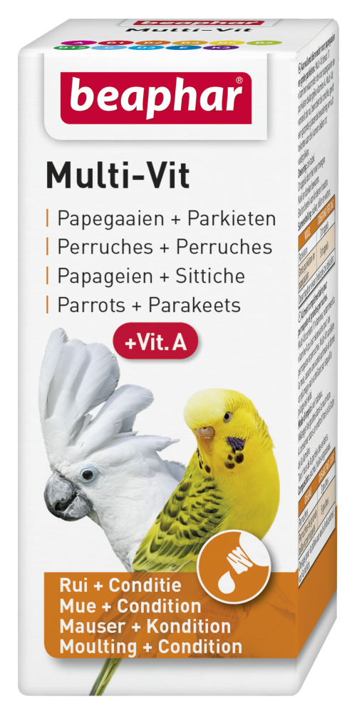 Bevat 12 verschillende soorten vitaminen waaronder de voor papegaaien en grote parkieten belangrijke vitamine A. Multi-Vit versnelt de rui, bevordert de conditie geeft een gezonde, glanzende bevedering en vult tekorten aan die kunnen leiden tot vederpikken.