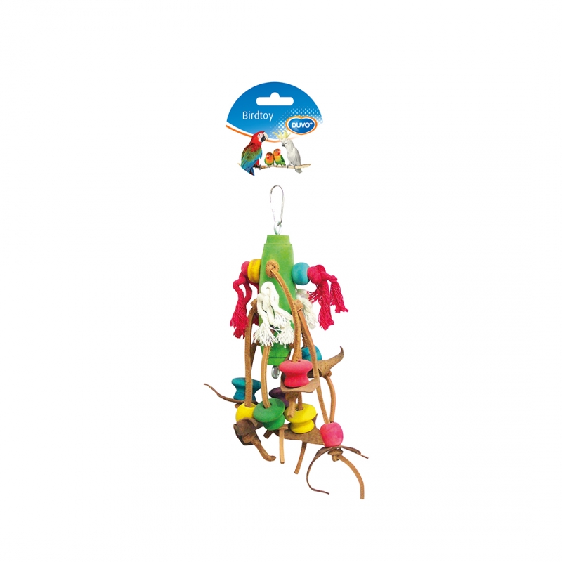Vogels vinden kleurrijke speeltjes echt leuk. Dit Duvo+ speeltje gemaakt van katoentouw, lederen lintjes en houten blokjes is een heerlijk speeltje om in te klimmen of om aan te knabbelen. Het houdt je vogels actief en je bevestigt het eenvoudig in iedere volière met de hanger.